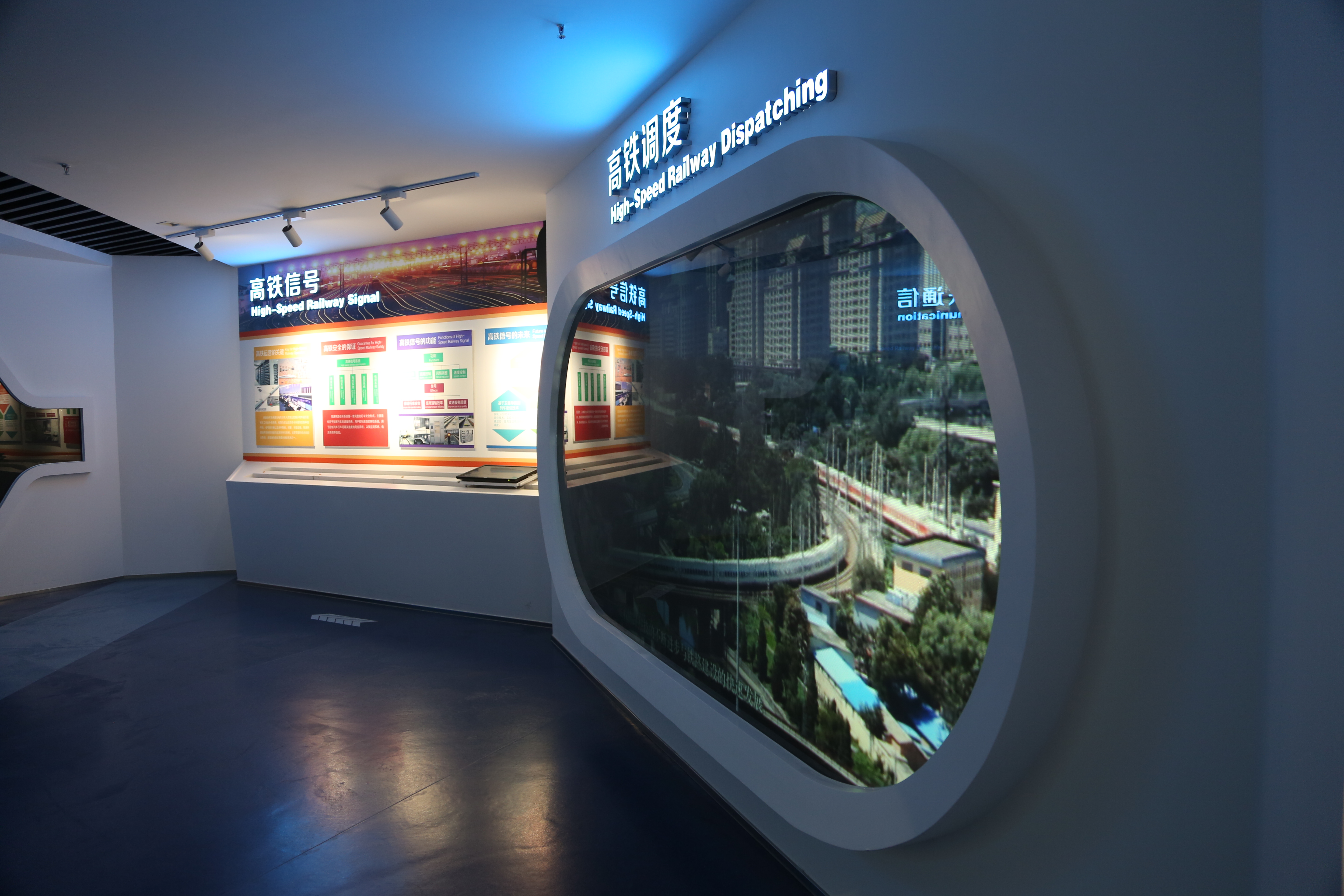 武漢高鐵展覽館,位于湖北省武漢市武漢高速鐵路職業(yè)技能訓練段內。為在接待非專業(yè)人士參觀之外滿足職業(yè)人士的學習需求,展覽館設在訓練段綜合教學樓,兼顧教學功能。展館設計上最大的亮點就是以“高速鐵路的發(fā)展”為線索和重要元素,將高鐵的過去、發(fā)展、成果、未來及高鐵技術轉變成可觸摸、可互動的趣味性展項,營造“科技創(chuàng)造高鐵”的主題氛圍,強調高速鐵路的現代科技高速動感。