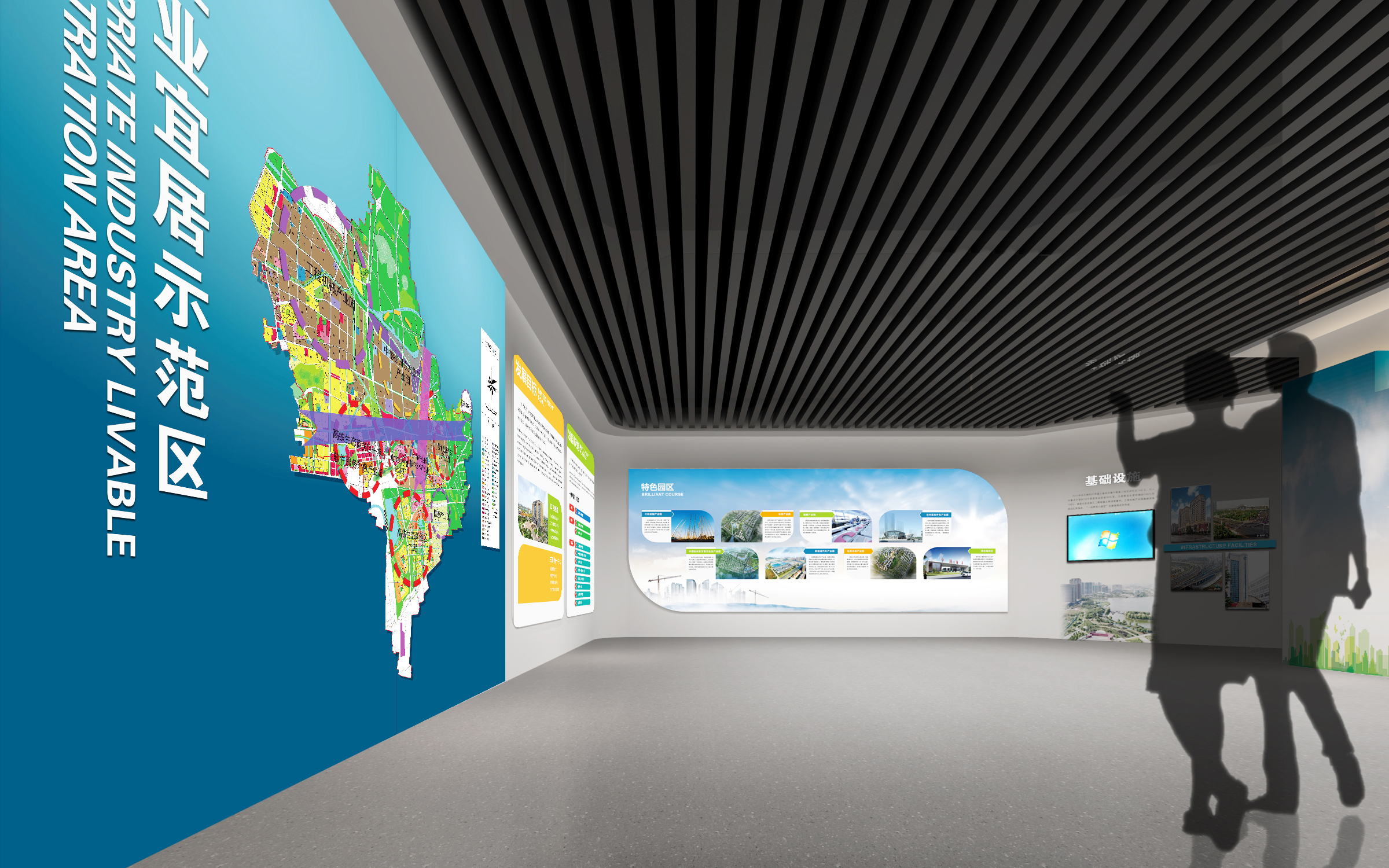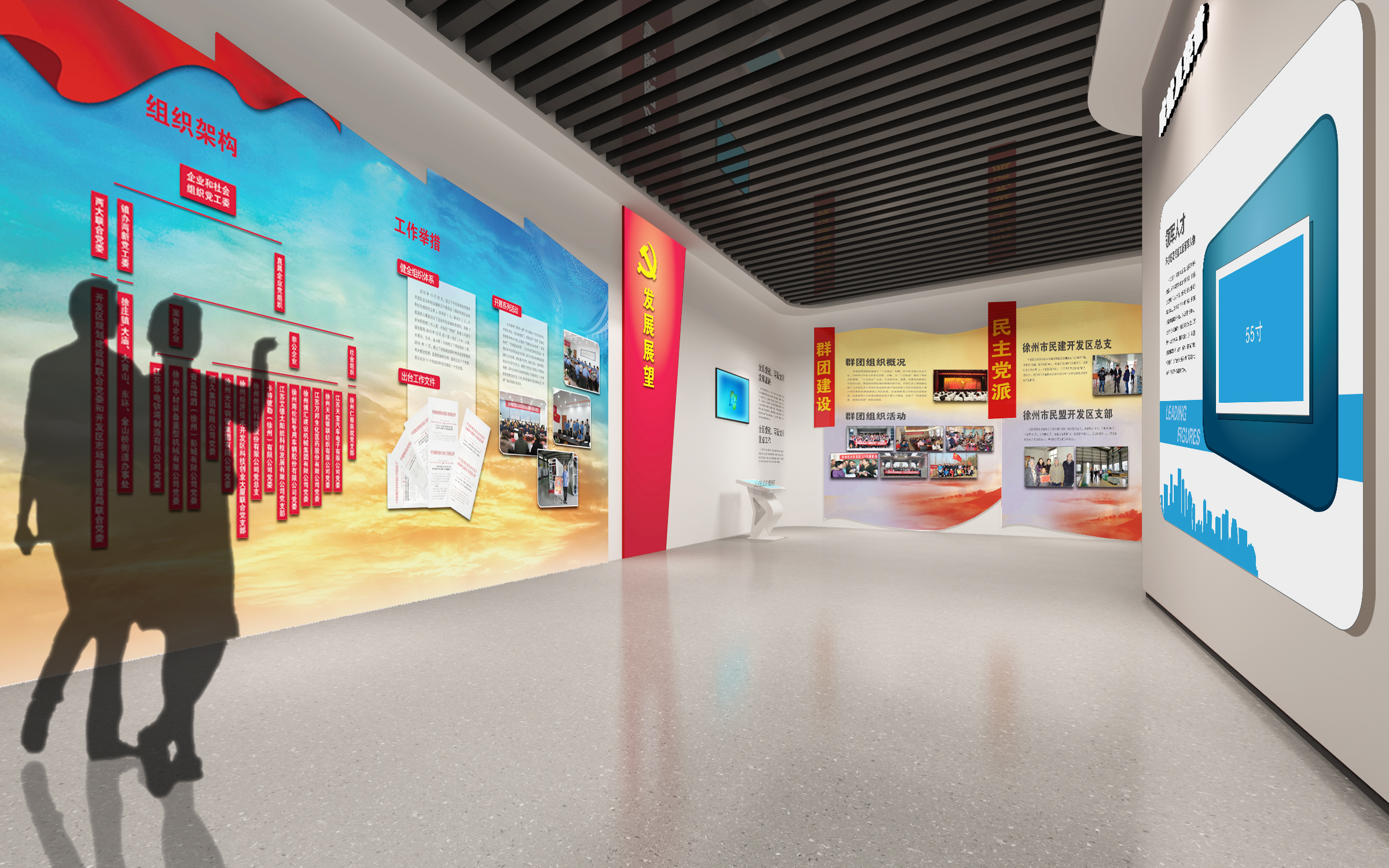 其中布展建筑面積約880平方米,共分為序廳、薪火相傳、開發(fā)區(qū)實(shí)踐、黨的建設(shè)、黨群建設(shè)等五部分,用流暢緊湊的參觀流線,系統(tǒng)展示徐州經(jīng)濟(jì)開發(fā)區(qū)全面貫徹黨的精神,緊緊圍繞“三次創(chuàng)業(yè)”的發(fā)展戰(zhàn)略,努力建設(shè)“經(jīng)濟(jì)強(qiáng)、百姓富、環(huán)境美、社會文明程度高”的升級版的國家級開發(fā)區(qū)的輝煌前景。另外配套設(shè)置了主題展廳、圖書閱覽室、黨員“創(chuàng)客”夢吧、群團(tuán)活動中心、心靈驛站、黨員教育室、遠(yuǎn)程教育室、接待室、咖啡吧、便民超市、辦公室、檔案室、流動黨員活動站、多功能廳等空間。