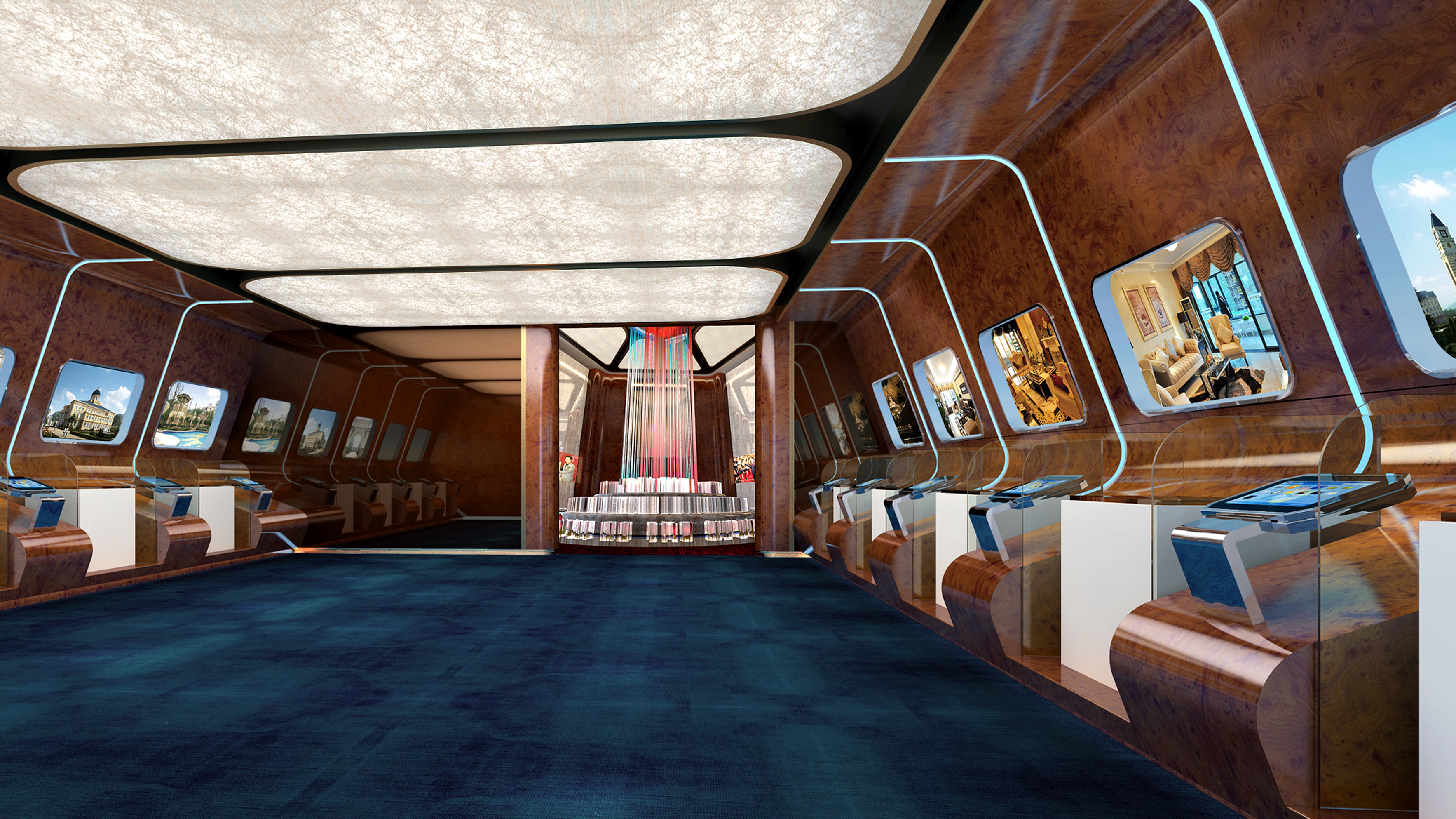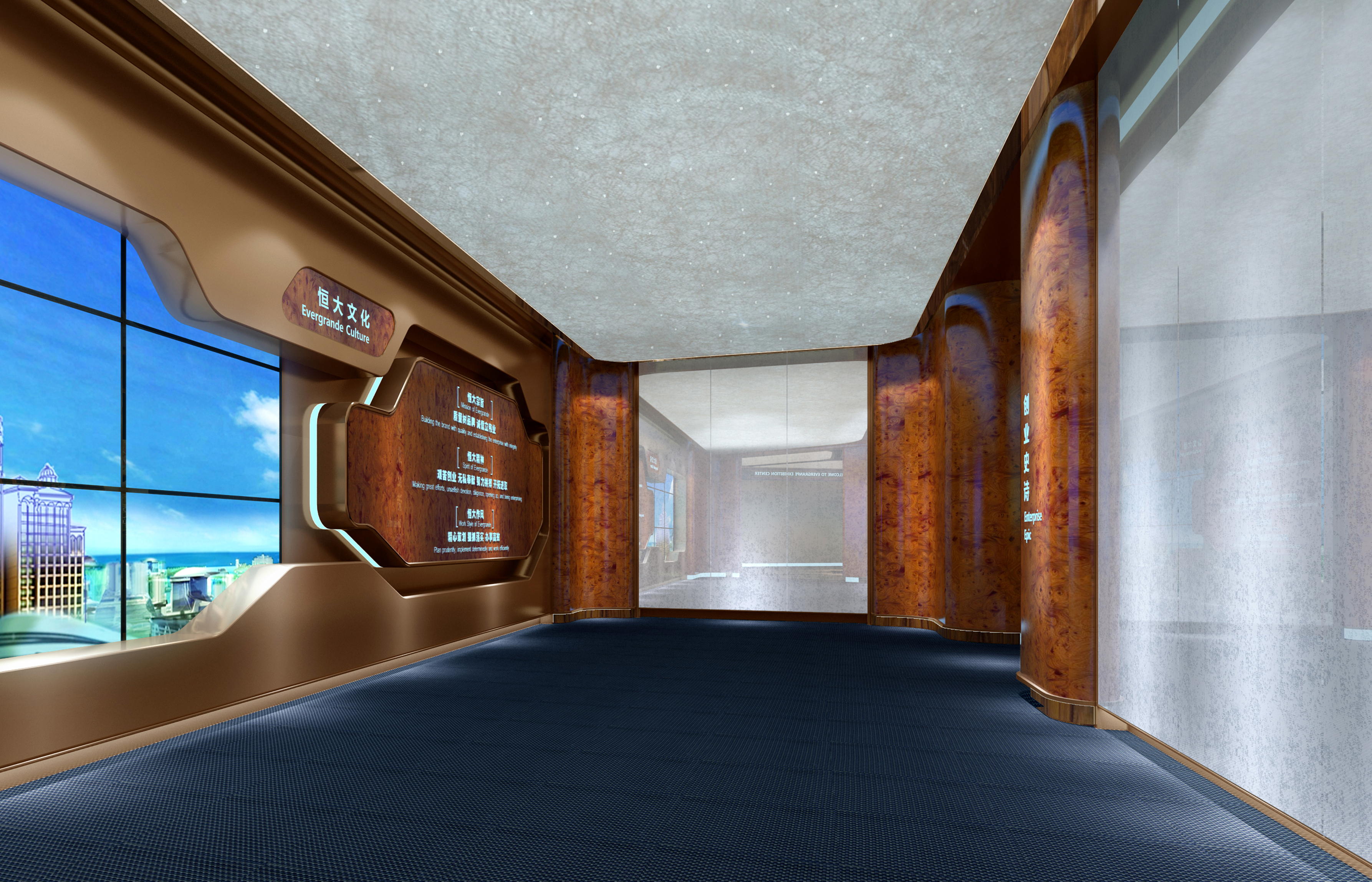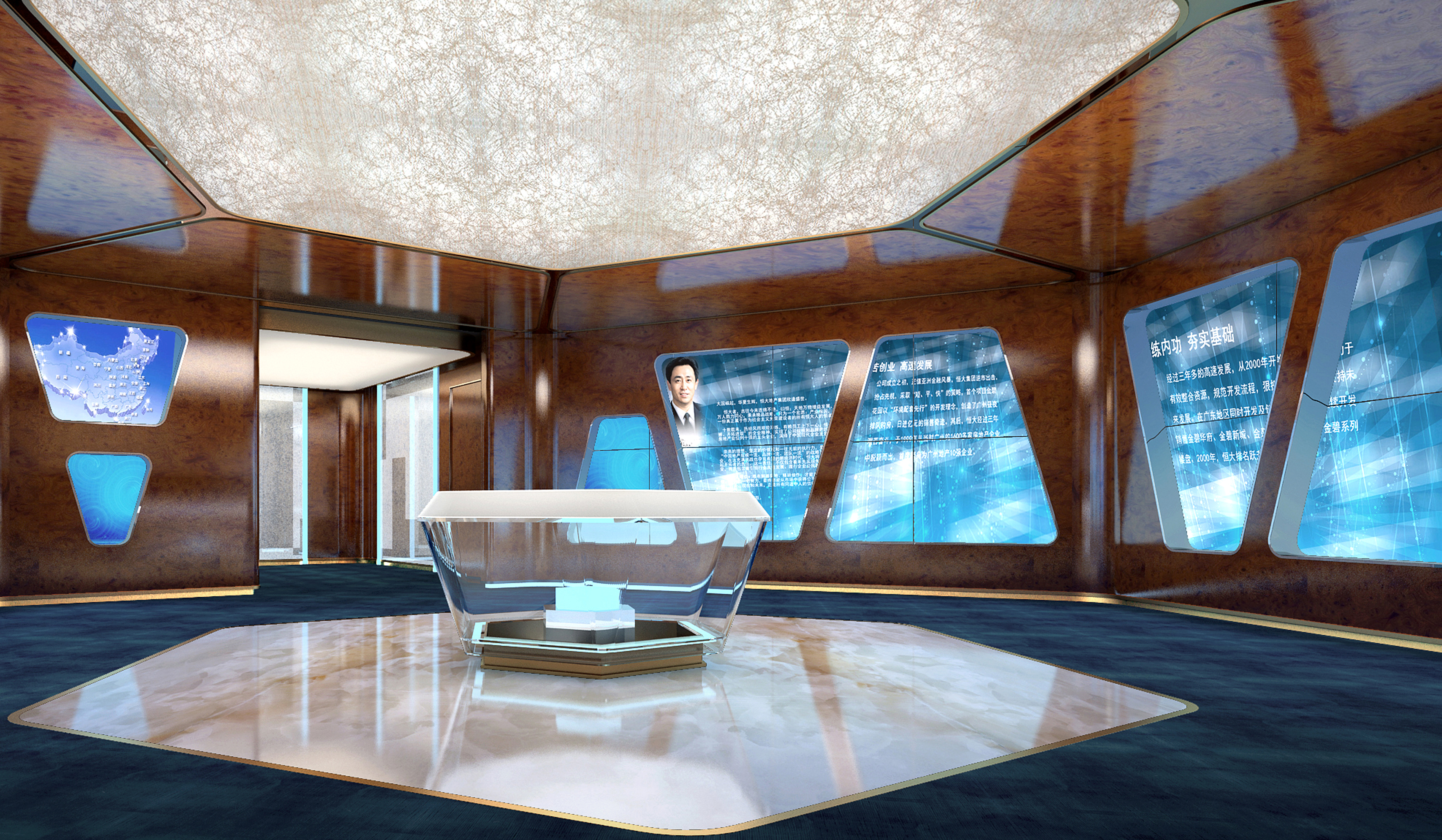 通過模型演示、數據展示、視頻、圖文及交互觸摸等多媒體技術搭建了一個“艱苦創(chuàng)業(yè)、無私奉獻、努力拼搏、開拓進取”的“百年恒大”,體現了其在明生地產等多領域追求的專業(yè)、極致和領導力。科技化的搭配下,融合歐美的設計風格,空間冷靜而注重細節(jié)。