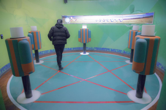 設(shè)計(jì)靈感來源于傳統(tǒng)的足球搶圈游戲,通過穿梭在人形柱地面的流光模擬足球的傳球,運(yùn)用感應(yīng)技術(shù)可實(shí)現(xiàn)搶斷球等功能。