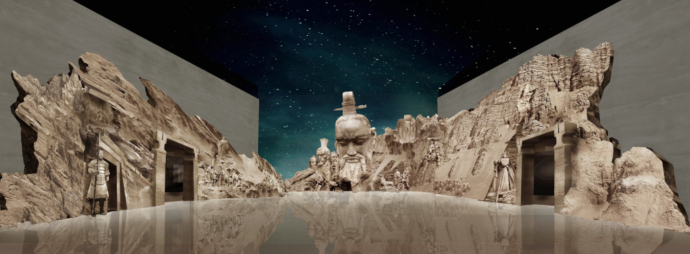 咸陽,作為中國歷史上的首座帝都,見證了秦帝國的榮耀與衰亡,更是華夏文明崛起的出發點。咸陽博物院序廳的設計將動態氛圍投影與靜態的雕像群相結合,創作出一組極具視覺沖擊的雕像群,秦文化節點人物與事件躍然其上,雕像與投影的動靜結合,開啟一場盛大的感官體驗。