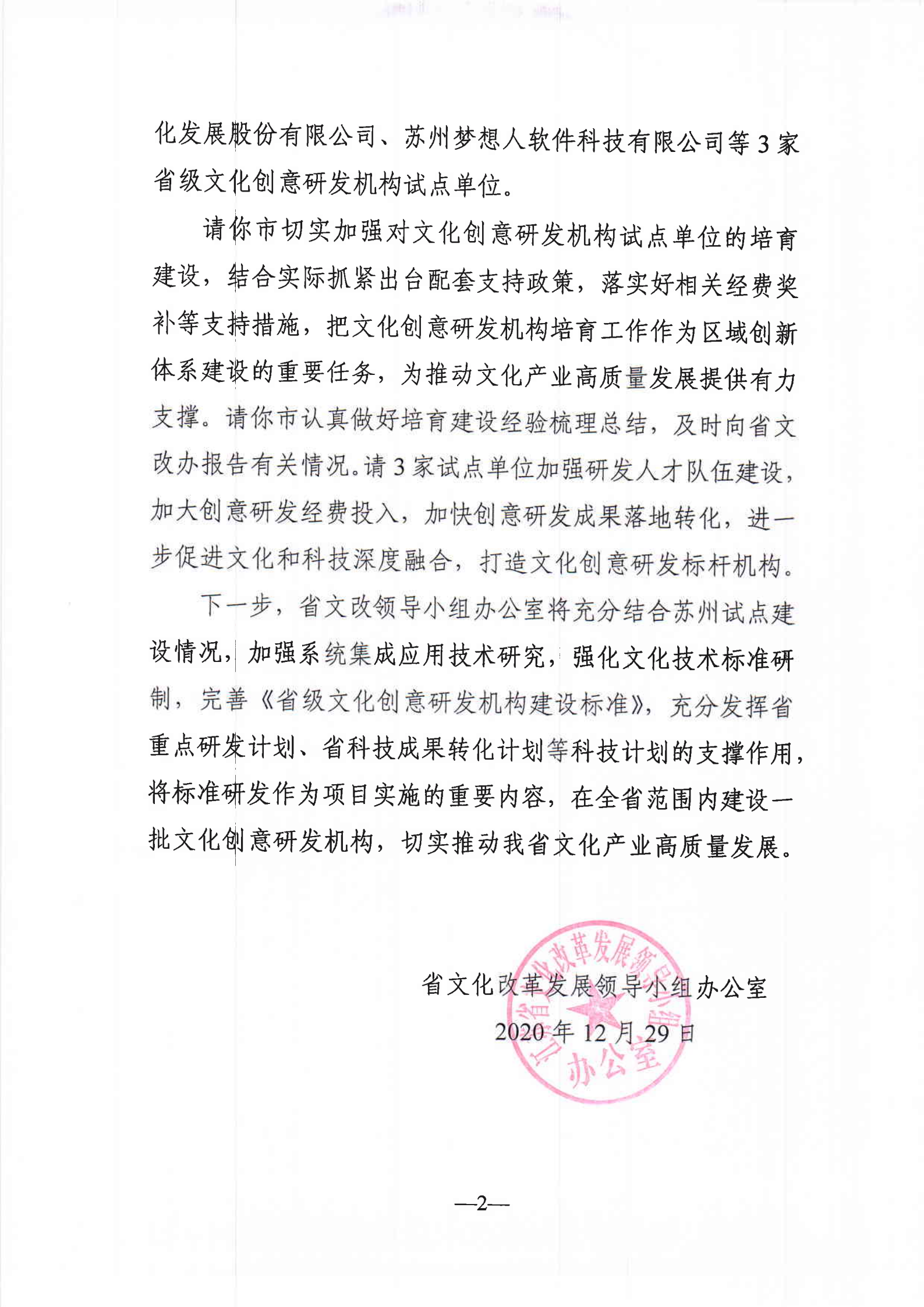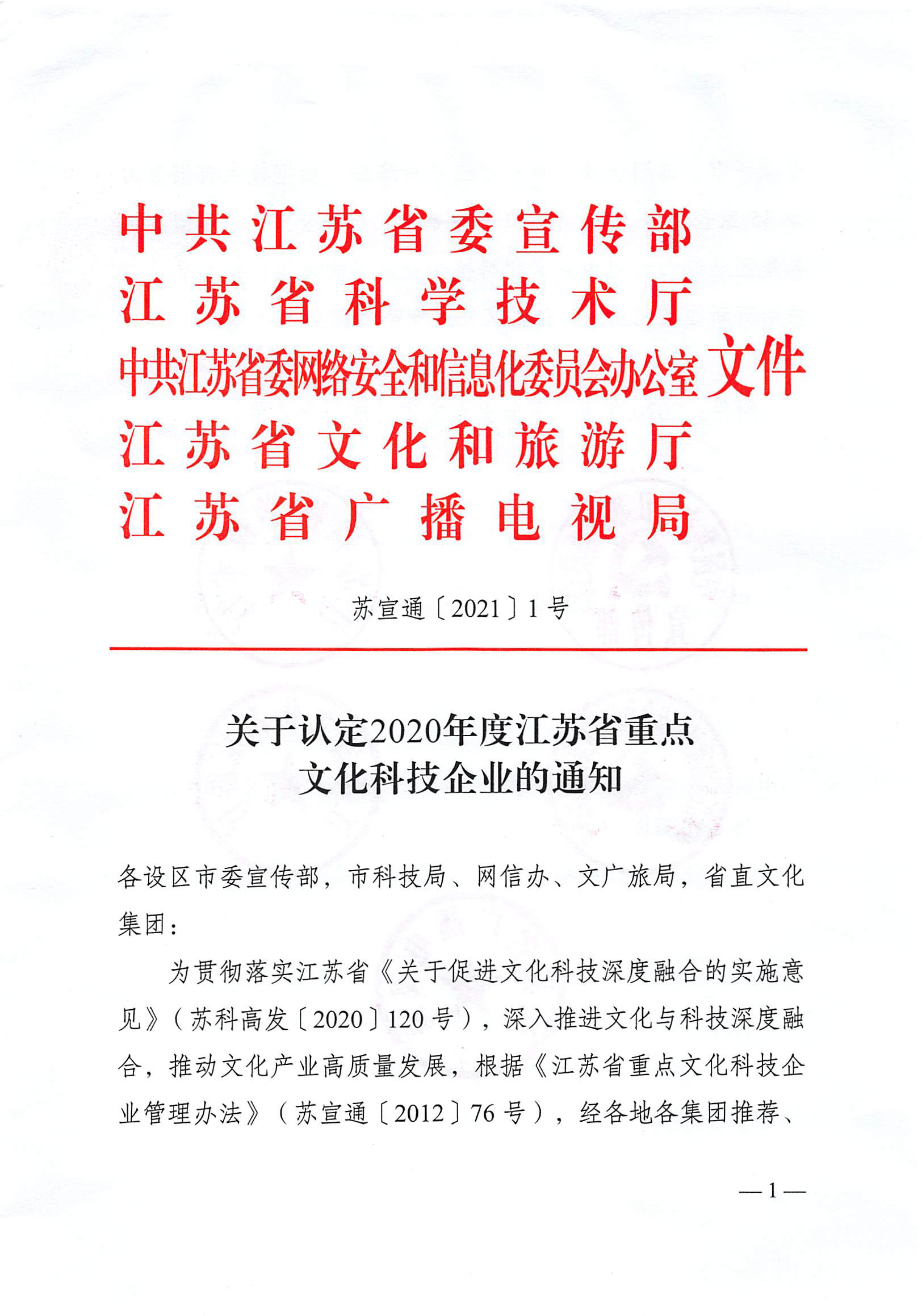 中共江蘇省委宣傳部、江蘇省科學(xué)技術(shù)廳、中共江蘇省委網(wǎng)絡(luò)安全和信息化委員會辦公室、江蘇省文化和旅游廳、江蘇省廣播電視局聯(lián)合發(fā)布了“關(guān)于認定2020年度江蘇省重點文化科技企業(yè)的通知”,金螳螂文化公司榜上有名 。