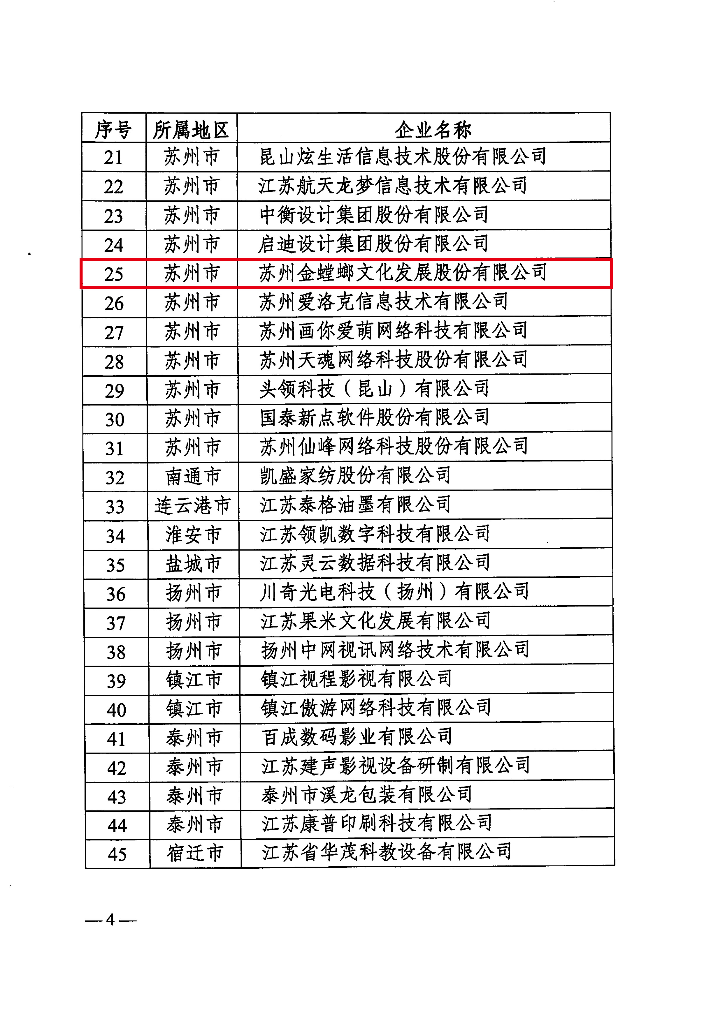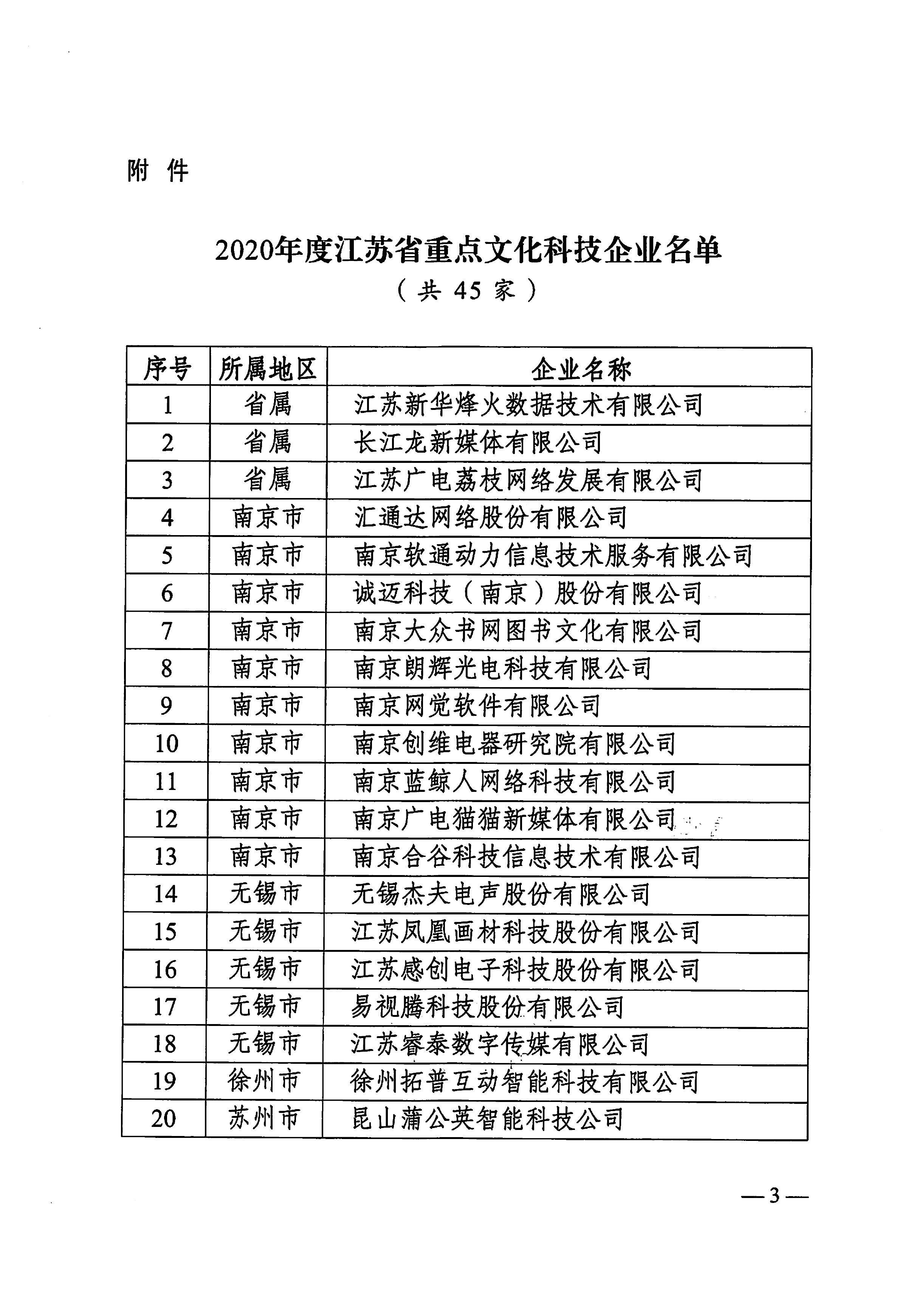 為貫徹落實江蘇省《關(guān)于促進文化科技深度融合的實施意見》,深入推進文化與科技深度融合,推動文化產(chǎn)業(yè)高質(zhì)量發(fā)展,根據(jù)《江蘇省重點文化科技企業(yè)管理辦法》,經(jīng)各地各集團推薦、專家評審、部門會商,現(xiàn)認定蘇州金螳螂文化發(fā)展股份有限公司等45家企業(yè)為2020年度江蘇省重點文化科技企業(yè)。