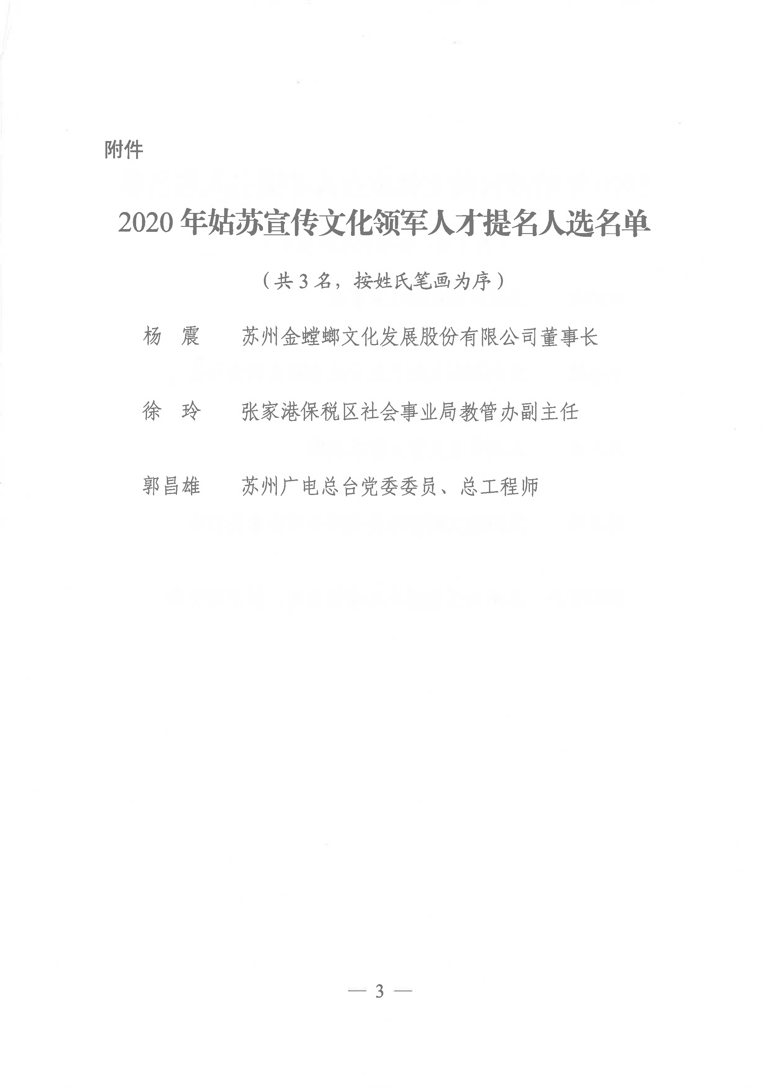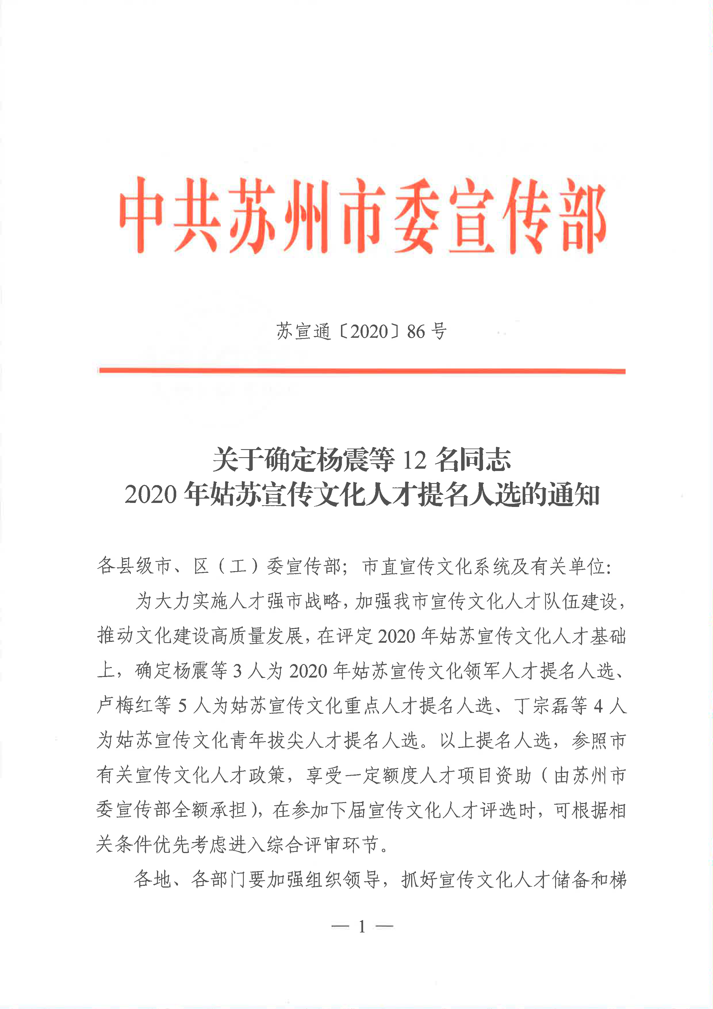中共蘇州市委宣傳部發(fā)布了2020年姑蘇宣傳文化人才名單,確定金螳螂文化董事長楊震先生2020年姑蘇宣傳文化領(lǐng)軍人才提名人選。