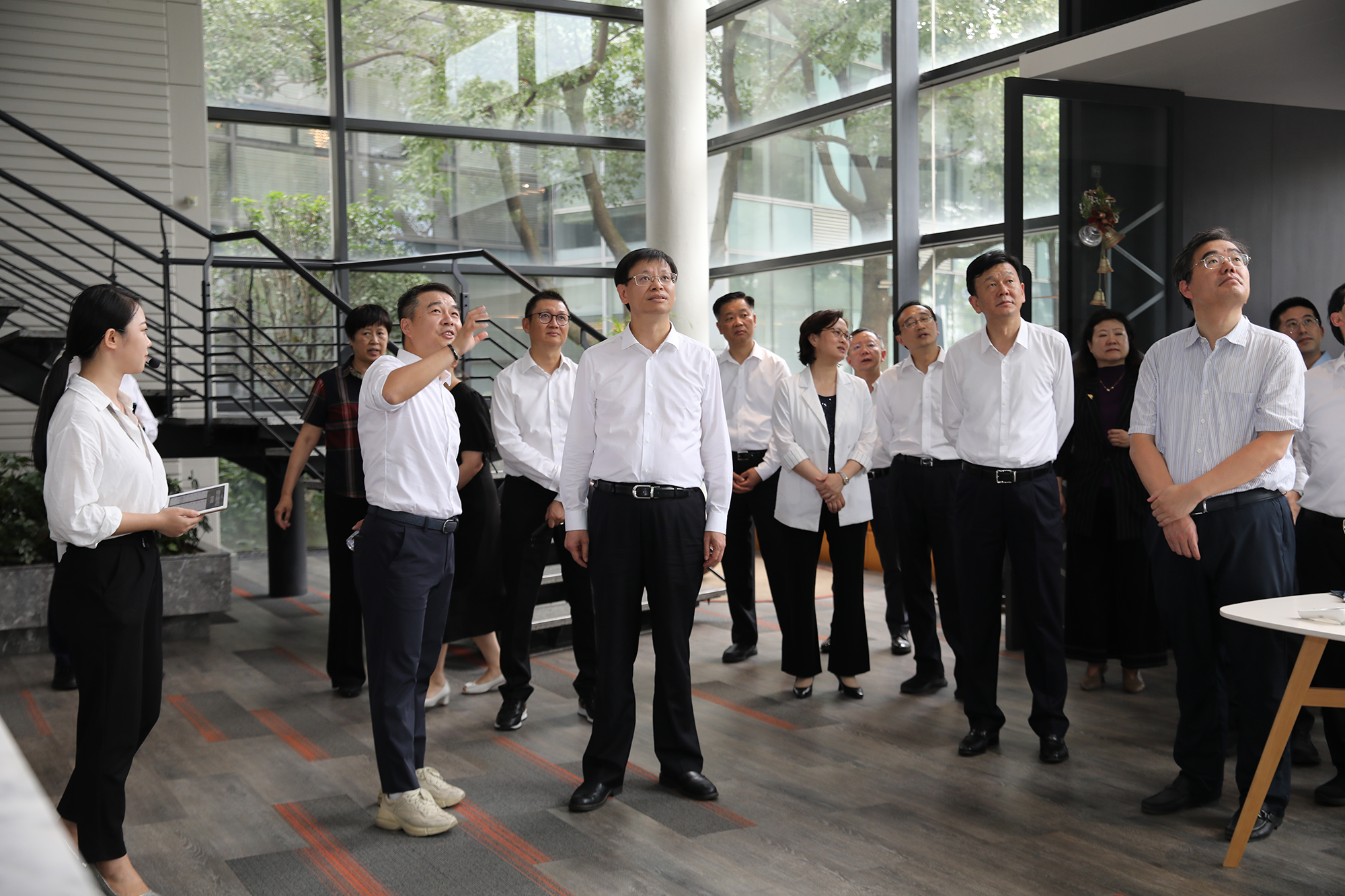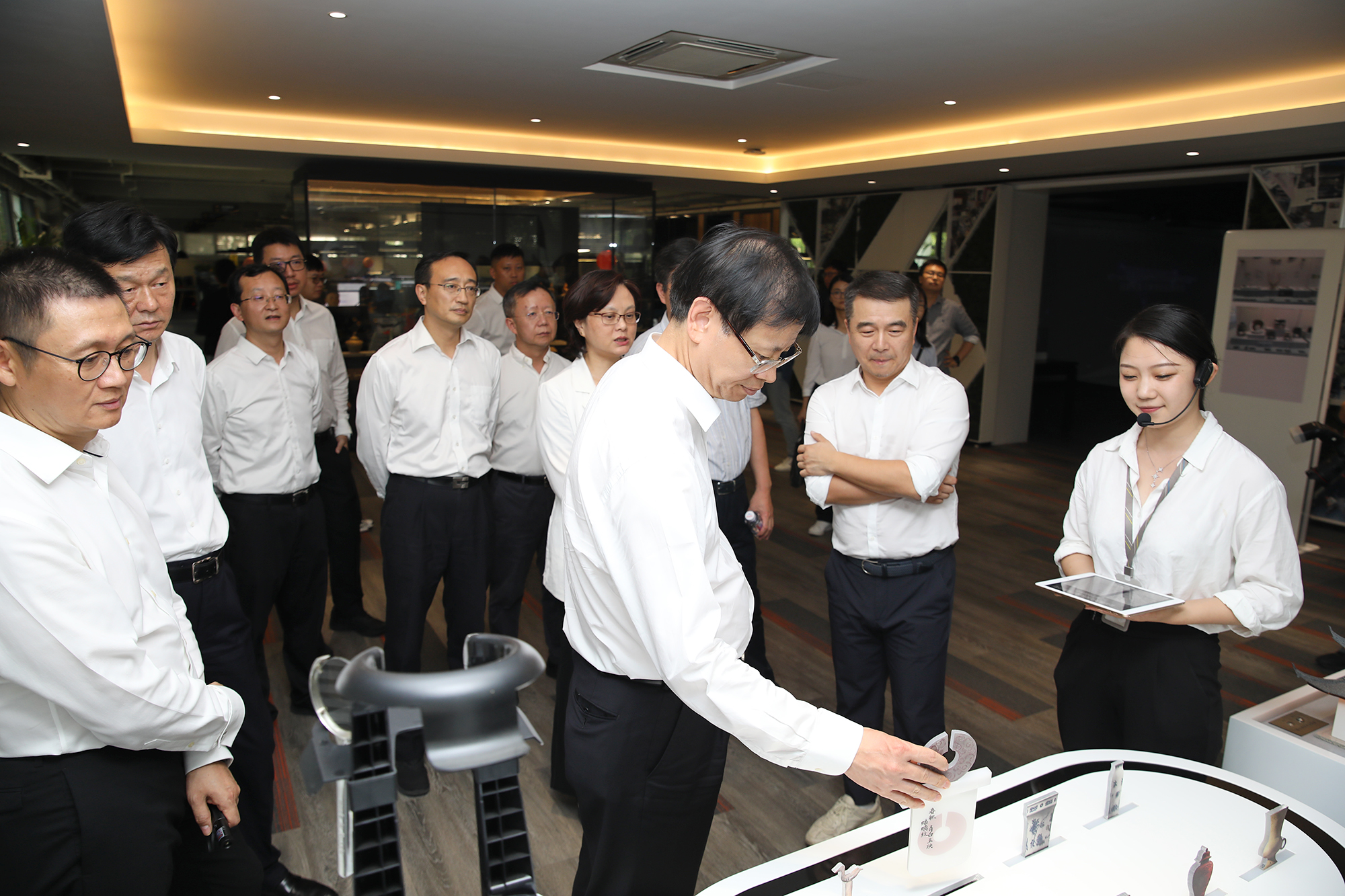 許書記詳細聽取金螳螂文化公司相關(guān)業(yè)務介紹,實地體驗科技產(chǎn)品應用情況,勉勵企業(yè)繼續(xù)加大科技研發(fā)投入,豐富展陳設計,借助金螳螂文化總部大樓建設的契機,打造文化創(chuàng)意的新高地。
