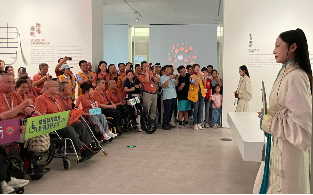 2017年,浙博開始啟動無障礙建設項目。在設施上,浙博在人文探索體驗館打造“無障礙國寶體驗區”,視障人士可觸摸十大鎮館之寶復制品、盲文標識,掃碼收聽無障礙語音導覽;聽障人士可觀看電子屏中的手語講解。場館內還配備有無障礙電梯、無障礙衛生間、無障礙服務臺