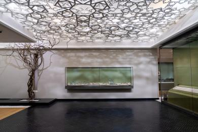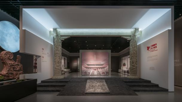 展廳以現代簡約風格為基底,解構重組江南文化內涵,模糊文物與空間界限。融江南造園手法于空間規劃,從“形、色、光、質”維度飾以現代材料與傳統工藝,打造寧靜通透、靈動舒適的觀展空間。